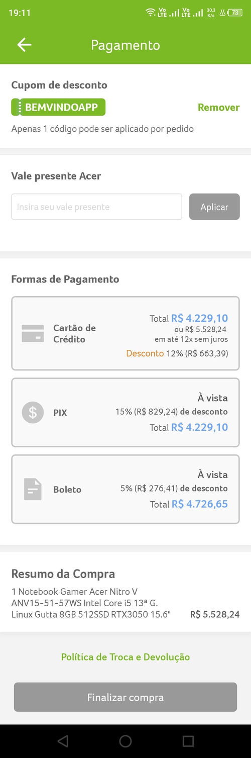 (APP) Notebook Gamer Acer Nitro V i5-13420H RTX 3050 8GB 512 GB Linux