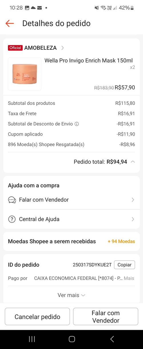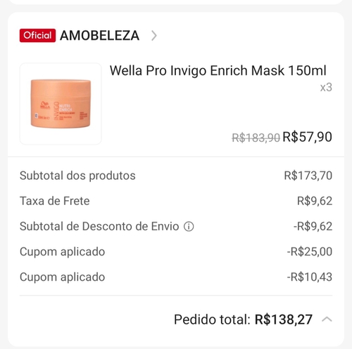 Comprei 2 e 1 shampoo wella oil...tem cupom de 20,00 acima de 120,00. Vamos ver se vai chegar 🙏