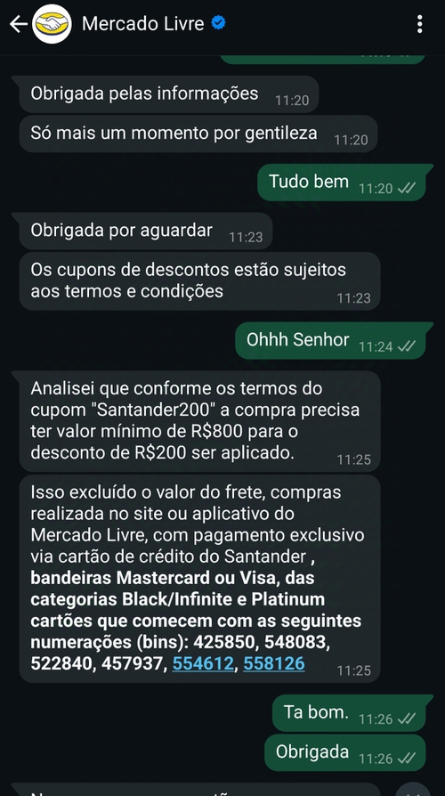 Contatei o MercadoLivre porque o cupom não tava aplicando com o cartão Santander.