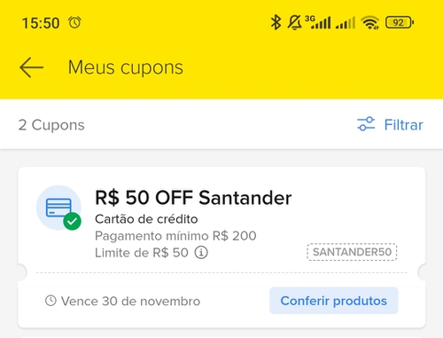 Santander tá sinistro, cupom 100 acima de 300, nunca vi melhor kkkk usei em 3 contas e ainda descobri que numa conta antiga tinha um de saldo MP 50 acima de 100. Estouro.
