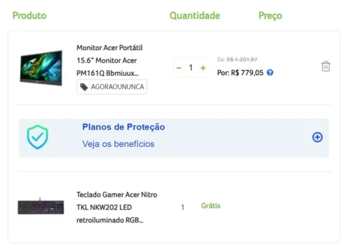 (Com Cashback Pelando R$662) Monitor Acer Portátil 15.6” PM161Q Bbm + Teclado Gamer Nitro TKL NKW202 com LED