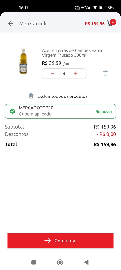 O azeite é bom, costumo comprar no mercado, mas o cupom aqui deu essa msg de 100 reais tb, mesmo com compra dando mais de 150.