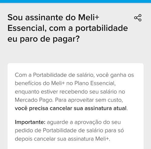 Se liguem na promessa do MP, quem tem portabilidade salarial ativa tem direito aos benefícios do Meli+ essencial de graça!👇🏼