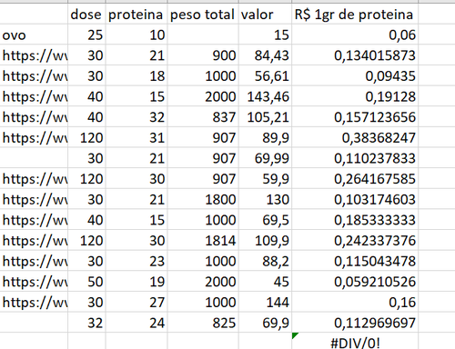 eu sou meio noob, mas neste momento estava fazendo umas coisas e levantei uma planilha, esse não me pareceu muito vantajoso, claro que ainda tenho de avaliar o frete etc, mas neste aqui a 1 gr de proteina sai a R$ 0,11297 se alguem quiser consumir ovo vale mais a pena, me corrijam se eu estiver errado, considerei um pente de ovo que na verdade seriam 30, porém sempre tem ovo estregado então....