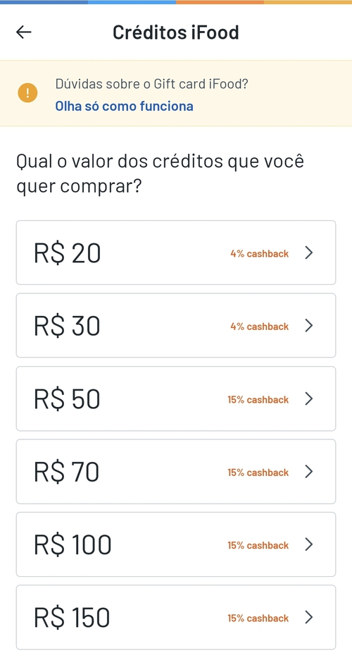 Atenção ao meio de pagamento, você só consegue pegar Gifcards ifood com saldo na carteira que pode ser adicionado sem custo via PIX ou se optar pelo cartão de crédito adicione a taxa de 3,99% deixando o valor final de Cashback em 11%, ainda muito bom na minha opinião.