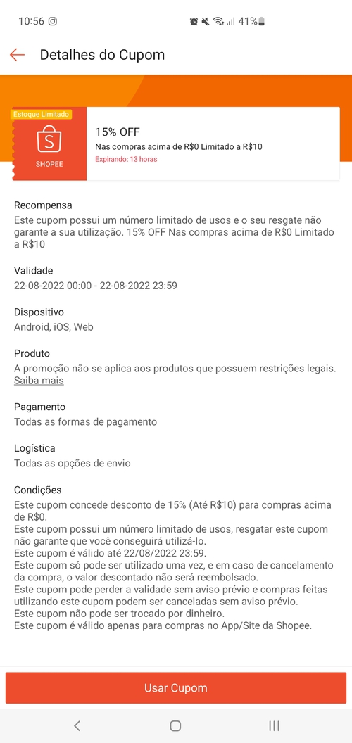 Aqui aplicou, mas como 15% OFF sem valor mínimo. Limite de 10 reais off