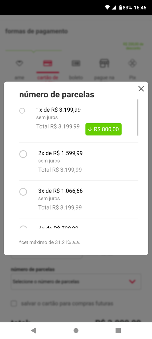 Importante lembrar que o preço só muda após colocar os dados do Cartão AME na aba de pagamento e depois selecionar as parcelas