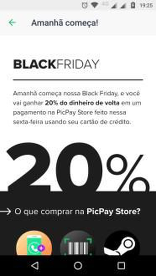 Na promoção Black Friday PicPay todos os usuários recebem 20% do valor gasto no próximo pagamento feito para qualquer produto ou serviço disponível na PicPay Store ao utilizar o cartão de crédito como forma de pagamento.