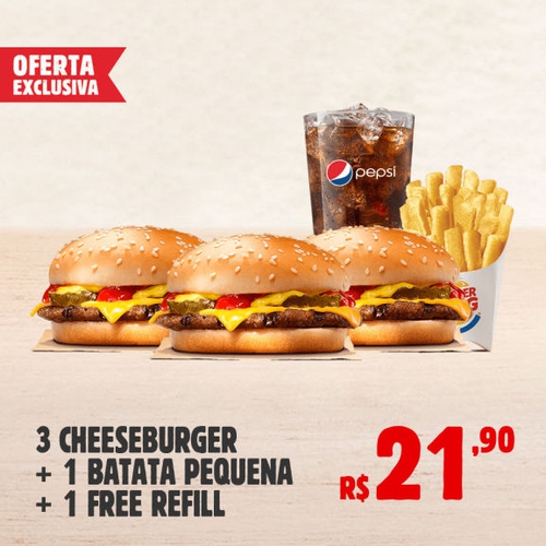 3 Cheeseburger + 1 Batata Pequena + 1 Refill no Burger King - R$21,90