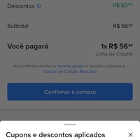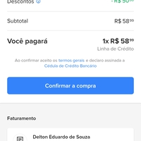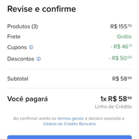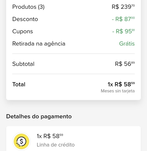 Como faz pra chegar nesse valor de 59? tenho os dois cupons mas o meu fica 70 reais, quanto tenho que pagar na linha de crédito e quanto tem que ser no cartão /pix