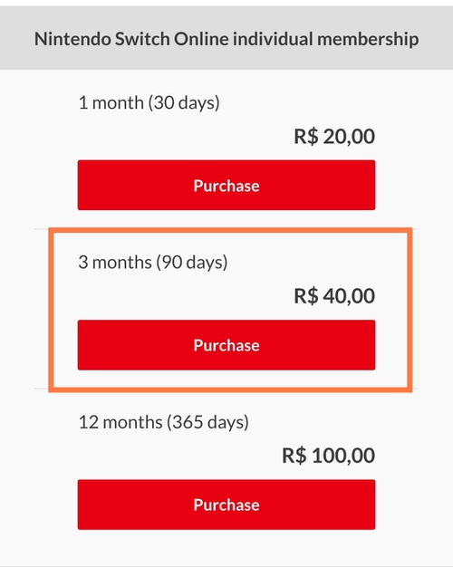 Mesmo plano no site da Nintendo, por R$40., por R$40.