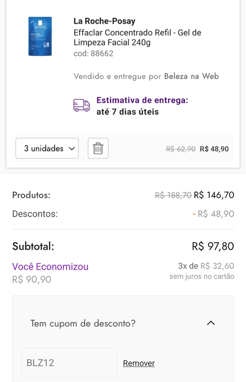 Adicionar 3 unidades no carrinho para 1 sair grátis. Se for primeira compra usar o cupom BLZ12 para ganhar frete grátis.