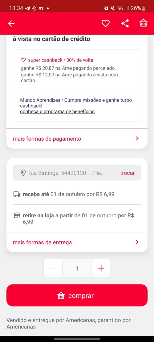 Aqui ainda aparece 39,90 mas no carrinho muda o valor e o cashback ta todo errado 🙄