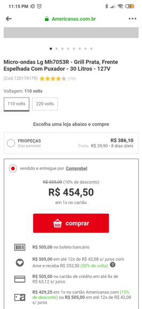 Pagamento a vista Cartão Americanas 15% desconto R$ 448,71 com cashback de R$ 224,36