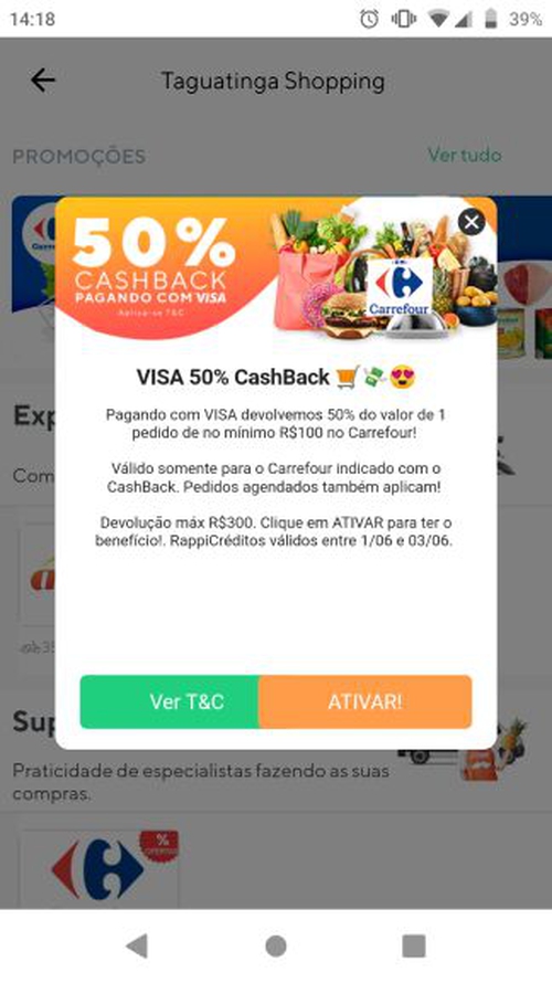Mecânica: Devolução de um valor percentual pré-definido (50%) em pedidos finalizados que ocorrerem a partir das 07:00h do dia 23.05, em RappiCreditos até às 23:59 do dia 24/05/2019 para todos os pedidos feitos na Rappi nas sessões sinalizadas com CashBack (Carrefour da sessão indicada com Cashback e Restaurantes). Cada usuário poderá ativar o benefício 1 única vez dentro do período. Válido só para Usuários Prime.