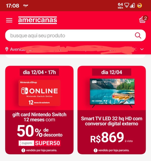 50% Gift Card da Assinatura Nintendo Switch Online na Americanas