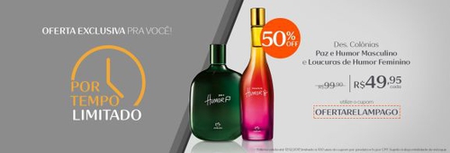 O cupom OFERTARELAMPAGO dá 50% de desconto na compra do Kit de Colônias da Natura: Colônia Loucuras de Humor (Feminino) e Colônia Paz e Humor (Masculino), cada item sai por R$49,90 :D