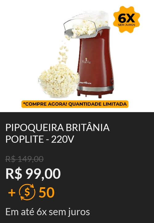 Troque 50 pontos + R$ 99 em até 6x sem juros pela pipoqueira