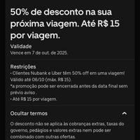 50% OFF corridas com CC Nubank, até R$15 de desconto por viagem