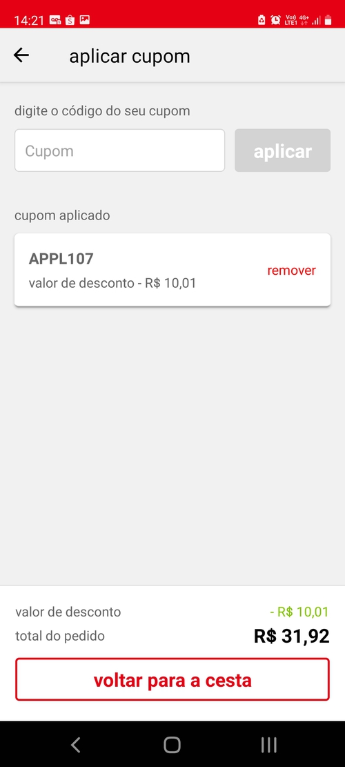 Peguei um produto de R$ 20 reais e consegui o desconto de 10 KKKK foi bom de qualquer forma