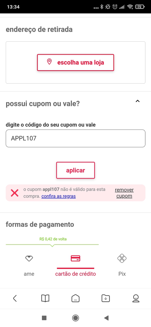 Pessoal, eu não tô conseguindo. Coloco no carrinho, o cupom entra mas na hora de pagar da erro. Já tente tirar em 3 cartões diferentes e nada.