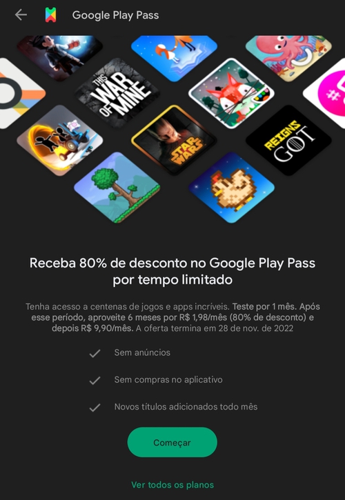 Black Driday Google Play Pass, desconto de 80% em 6 meses.