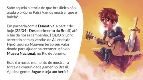 A Ubisoft Brasil deu o exemplo com Notre Dame, a gente resolveu trazer pra cá. De hoje até dia 24/04, TODAS as vendas de A Lenda do Herói serão revertidas em doações pra reconstrução do Museu Nacional no Rio de Janeiro.