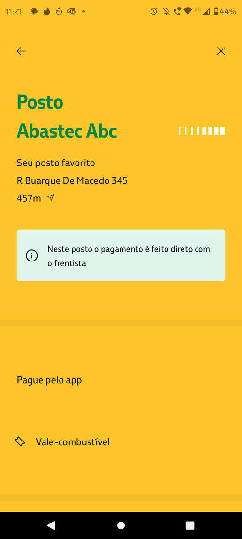 Sem falar que o app não permite o uso com o modo desenvolvedor ativado. E da última vez que tentei abastecer, recusou dois cartões (pagamento no próprio app, já tinha conseguido de outras vezes) e precisei pagar no débito na maquininha. Esse posto cobra mais barato pagamento pelo app (crédito, pix, MP...) e débito, o crédito na máquina é mais caro.