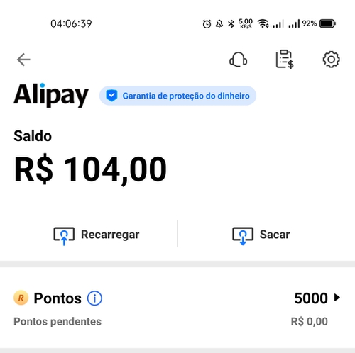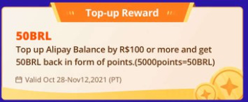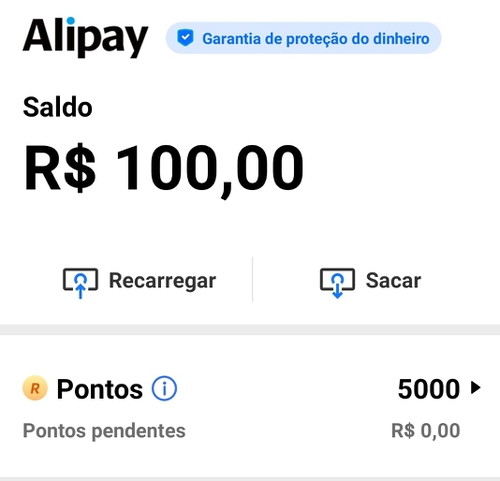 Recarregue 100 Reais na carteira Alipay e ganhe 5000 pontos = 50 Reais de bônus.