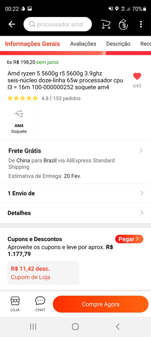 Bom preço, tô quase pegando um 5600G e repassando meu 3600. A diferença de processamento não é grande coisa, mas se a placa de vídeo queimar ou eu resolver vender não fico sem PC.