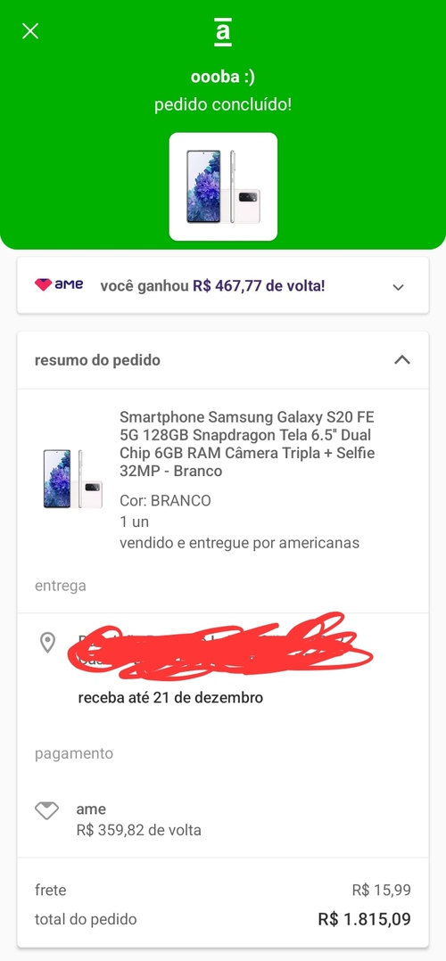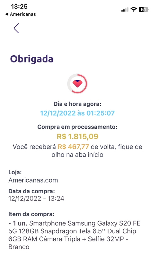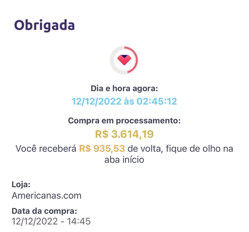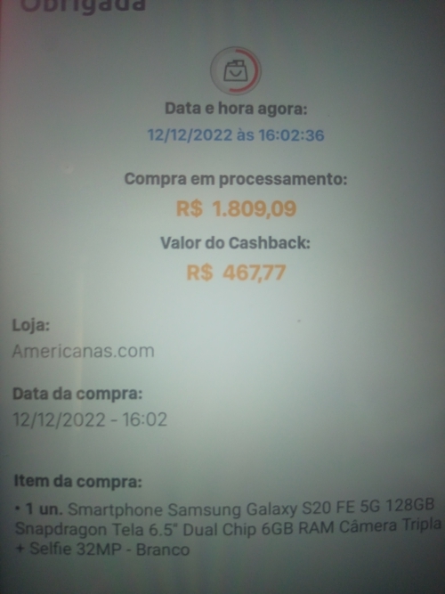 Tirei o print para reclamar, mas após o pagamento apareceu com o cashback correto de R$467,77.
