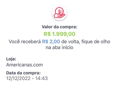 Aqui aparece o cashback correto no app da Americanas, mas diminui quando vai pro Ame
