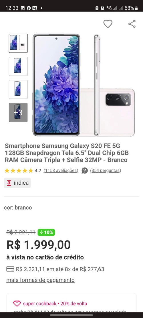 Aqui tá dando só 2 reais de Cashback (sou SC)Ta top esse preço a vista no pix pra pegar 400 de cashback, o meu caiu super rápido... Comprei pela Samsung tem menos de 3 meses e ganhei me devolveram 400 também e paguei 2000 parcelado....