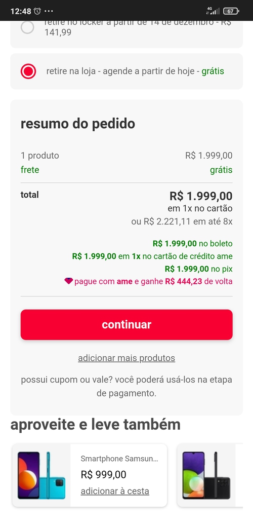 Quebrou a promoAqui aparece R$ 1.999,00 no desktop retirada grátis e R$1799 alguma coisa no app porém pra retirar na loja sai uns R$150 reais :(