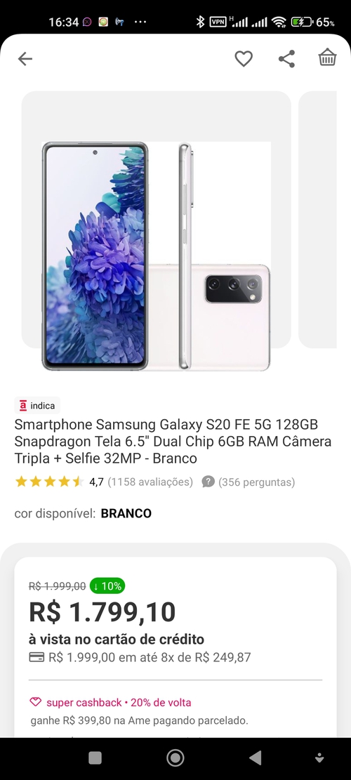 Aqui fica 1555 com AME. Pra mim celular está custando 1999 pra outros está 1799O valo menor é por causa do casback de 20% com ame.