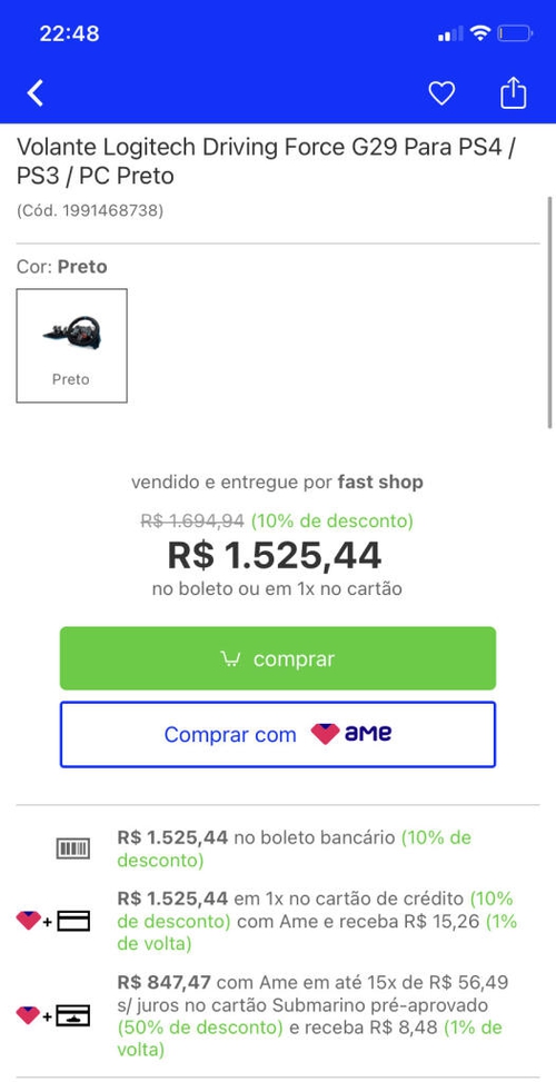 [AME + CC Sub R$848] Volante Logitech Driving Force G29 Para Ps4 / Ps3 / Pc Preto R$1525
