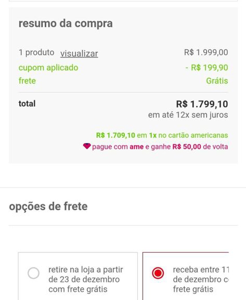 Utilizei o cupom e foi para 1799. Para ficar no valor de 1650 tem que pagar com AME + o cupom
