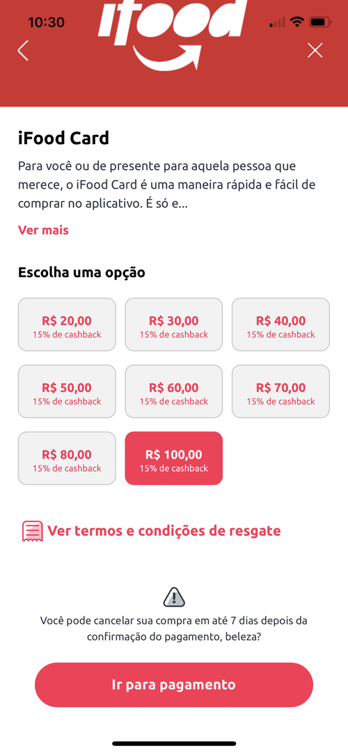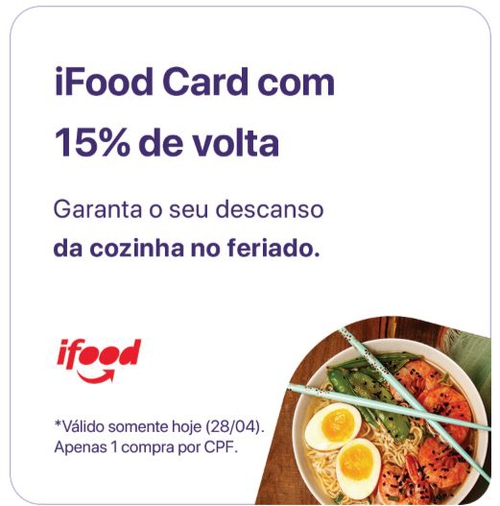 IFOODCARD com 15% de cashback. Todos os valores. Somente hoje e 1 por CPF.