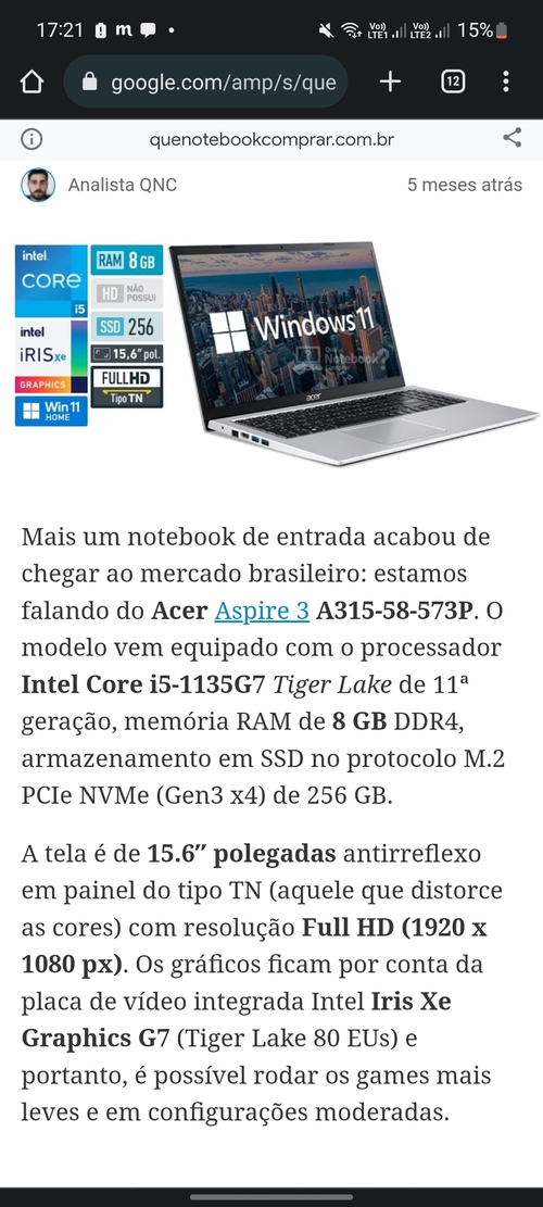 [AME R$1874] Notebook Acer Aspire 3 Intel Core I5-1135G7 8gb (intel Iris X E) 256GB SSD A315-58-5