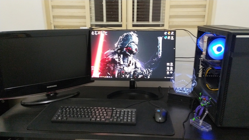 Hoje eu uso suporte elg pra monitor, o que me rendeu mais espaço ainda.