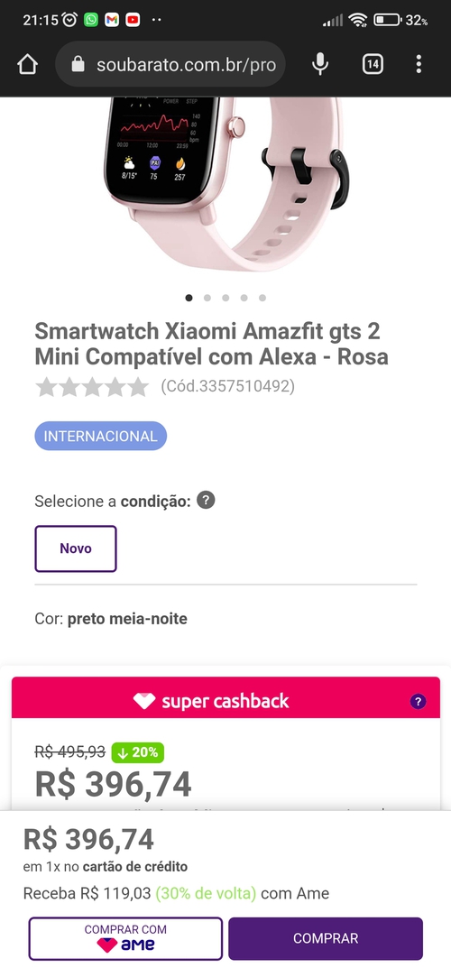 [AME R$ 223 ]Smartwatch Xiaomi Amazfit gts 2 Mini Compatível