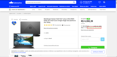 (AME R$3.990) Notebook Gamer Dell 15.6" Linux G15-i1000-d20p 10ª Intel Core I5 8GB 512GB SSD (GeForce GTX 1650)