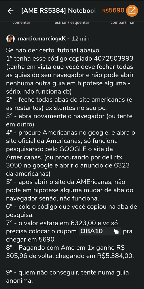4º - procure Americanas no google, e abra o site oficial da Americanas, só funciona pesquisando pelo GOOGLE o site da Americanas. (ou procurando por dell rtx 3050 no google e abrir o anuncio de 6323 da americanas)