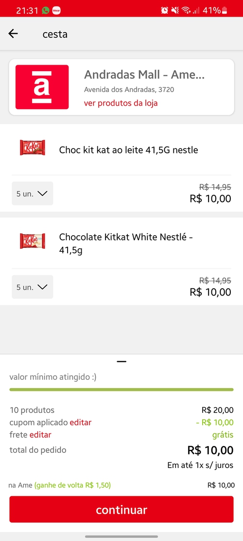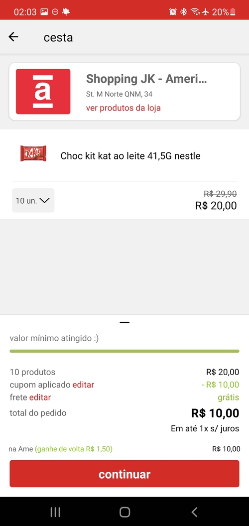 Paguei 18 por 20 kit kat usei o cupom APPL601+saldo ame