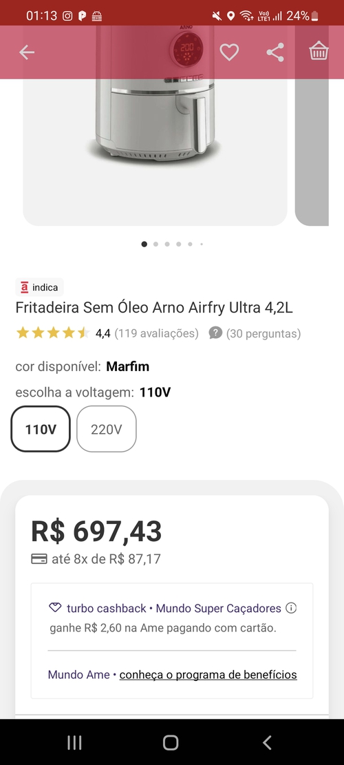 Vi relatos em outros posts de que o AME adiantou vários cashbacks na conta da galera pra usar. Aqui na minha nada... Se adiantassem os que tenho que receber dia 27, pegaria essa Airfryer sem receio, mesmo não precisando, rs.
