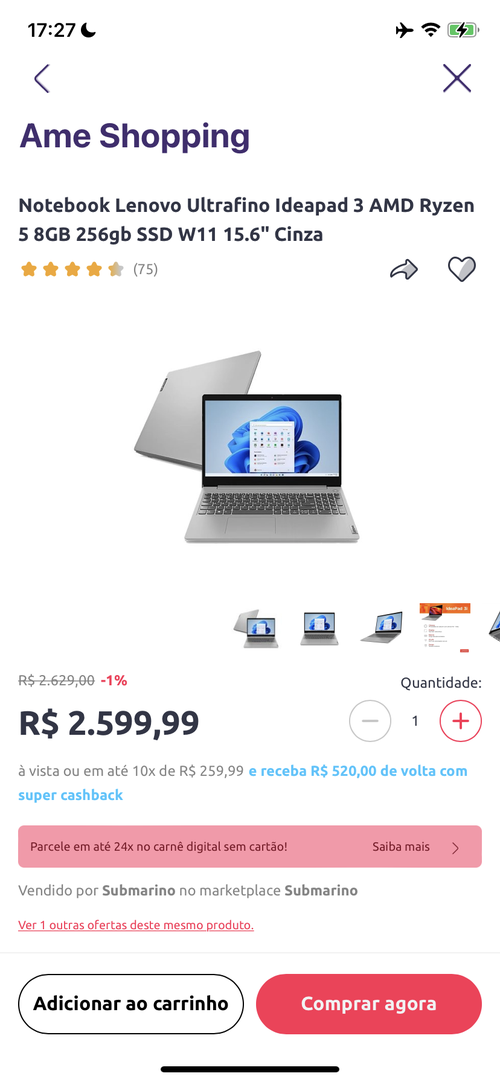 Comprei 1 no app ame e 2 no PC. Mas só depois de comprar vi que não apareceu o cashback. Vou entrar em contato com a AME e/ou submarino...