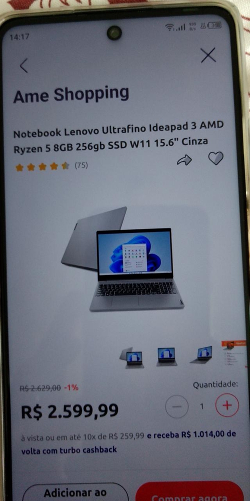 (Ame SC R$ 1.585) notebook Lenovo ideapad ultrafino 3 AMD RYZEN 5 8GB 256 GB W11 15.6