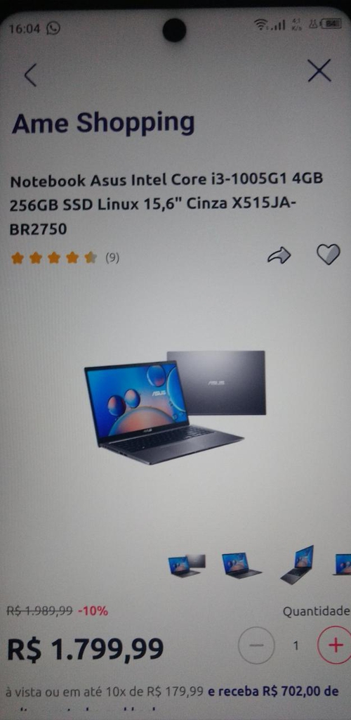 (Ame SC R$ 1097) NOTEBOOK ASUS INTEL CORE I3 1005G1 4 Gb 256gb Linux 15.6