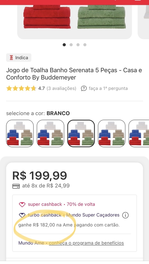 Esse mesmo jogo de toalhas ta saindo a 169,99 no shoptime, com 70% de cashback também e com mais opções de cores.
