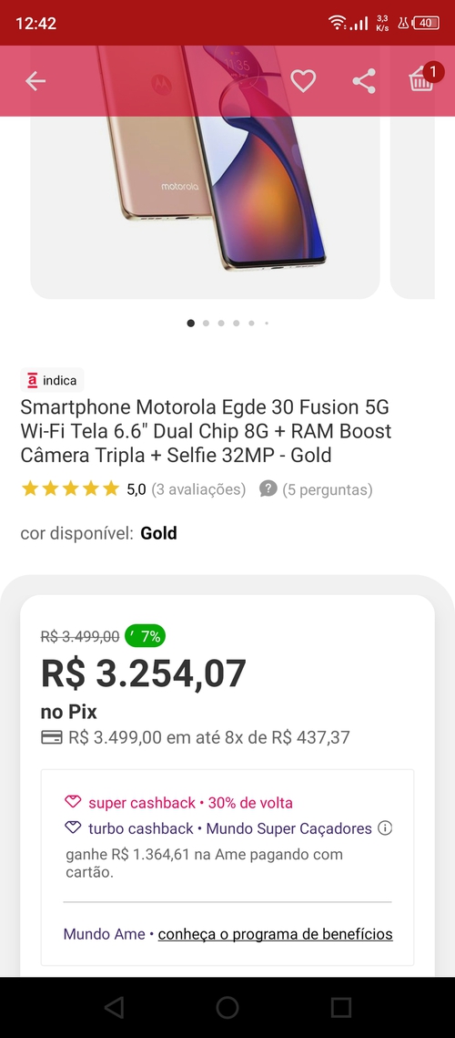 (AME SC R$ 2.134) Smartphone Motorola Egde 30 Fusion 5G Wi-Fi Tela 6.6 8G + RAM Boost Câmera Tripla